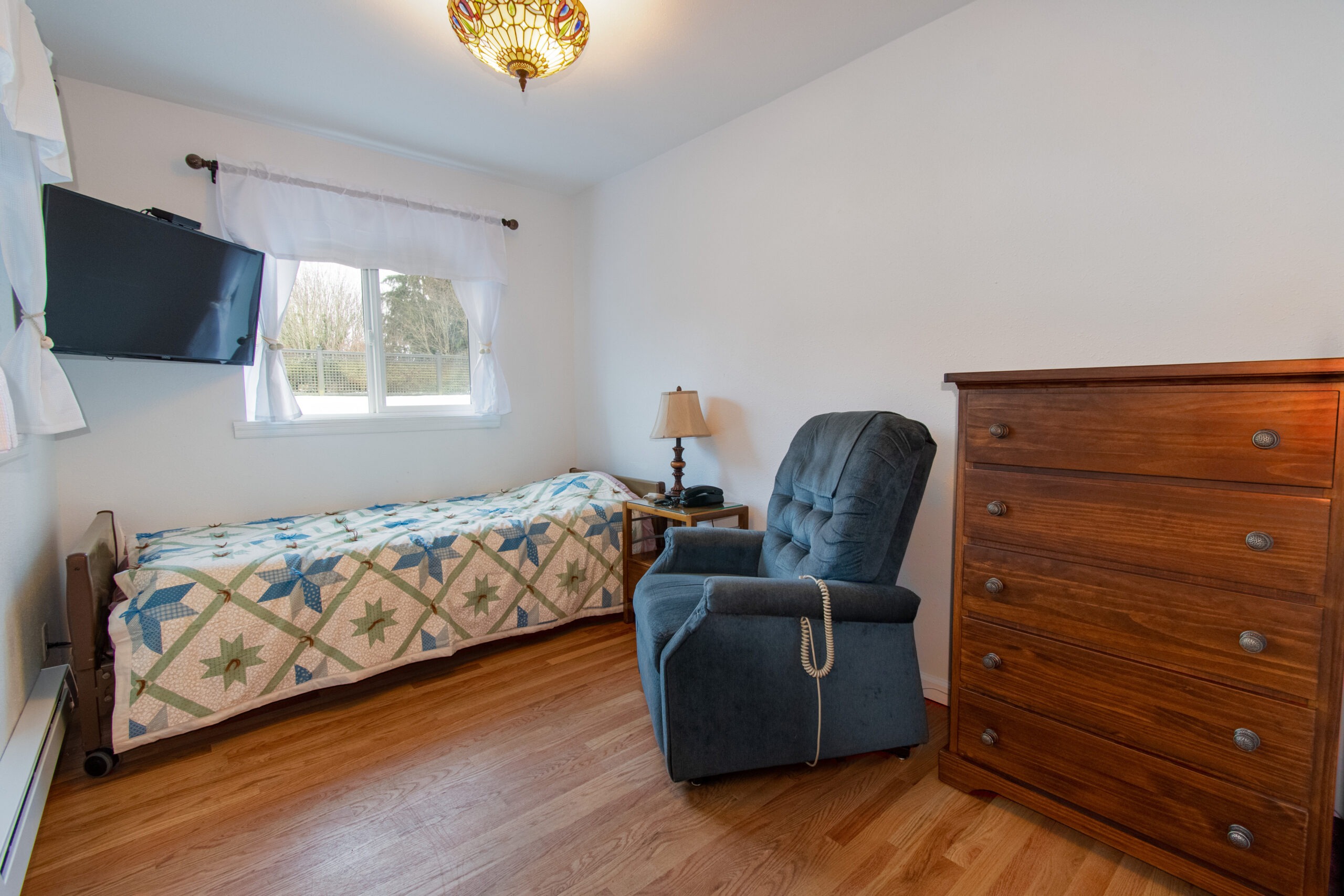 Bright and welcoming private bedroom with a closet and windows overlooking the garden, offering a peaceful place to relax. Furnished with a 3-motor hospital bed, nightstand with lamp, and flats creen TV. An electric lift chair is available if desired for extra comfort.